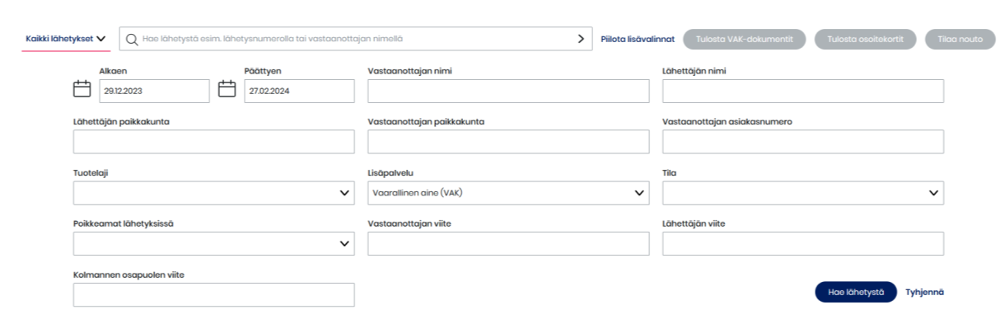 Voit hakea VAK-lähetyksiä avaamalla etusivun lähetyslistalta haun lisävalinnat ja valitsemalla lisäpalveluista Vaarallinen aine (VAK).