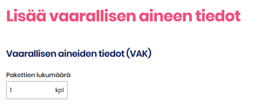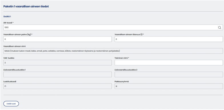 Jos paketti sisältää useampaa vaarallista ainetta, täytä kaikkien tiedot erikseen valitsemalla osion alaosasta Lisää uusi. Yksi paketti voi sisältää enintään kolmea eri vaarallista ainetta.