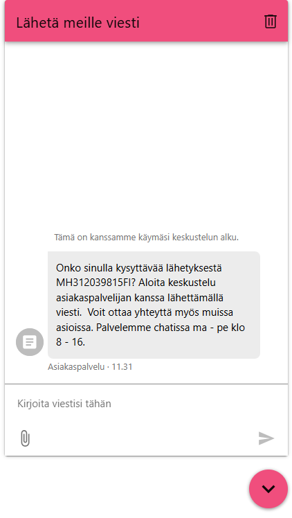 Jos haluat olla yhteydessä tiettyyn lähetykseen liittyen, kätevintä on avata etusivun lähetyslistauksesta yksittäisen lähetyksen tarkemmat tiedot. Sivun oikeassa alakulmassa on pinkki-kuvake, josta aukeaa chat.