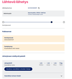 Valitse Lähetykset-osiossa lähetys, jonka haluat poistaa. Tämän jälkeen aukeaa tarkemmat tiedot. Paina ”Poista lähetys”. Jos haluat poistaa Ulkomaan paketin tai Lavarahdin, ole yhteydessä yritysasiakaspalveluumme.